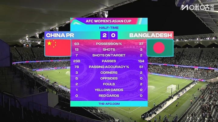 半場(chǎng)戰(zhàn)罷,中國(guó)女足控球率63%,13射7正打入2球,對(duì)手3射2正。中國(guó)女足上半場(chǎng)多次出現(xiàn)傳球失誤及錯(cuò)失良機(jī)的情況。
