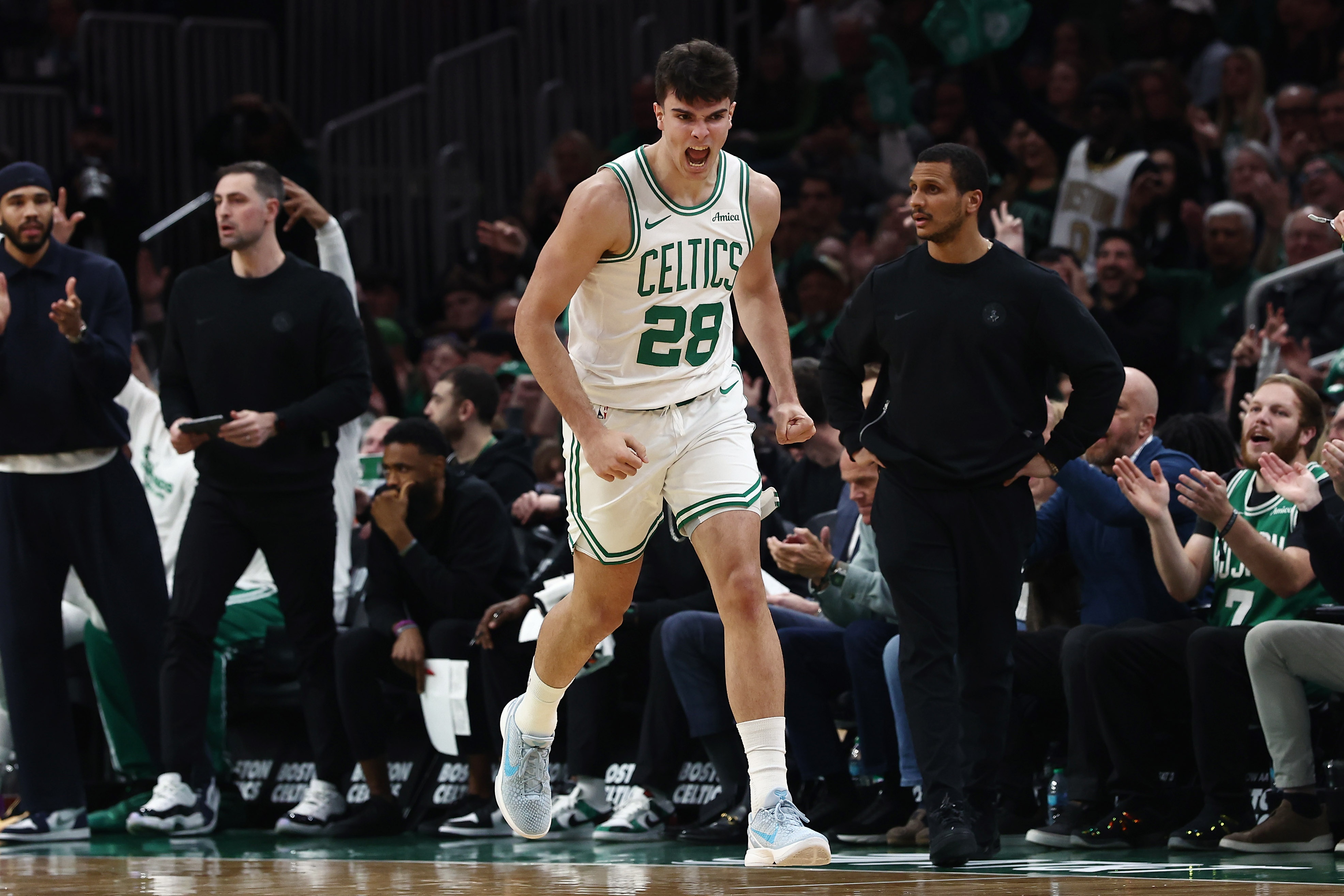 本場比賽28號秀新秀烏戈·岡薩雷斯打出新秀賽季代表作,全場出戰(zhàn)35分鐘15投7中,三分8中3,罰球3中1砍下18分16籃板3搶斷2蓋帽,前三項數(shù)據(jù)都是生涯新高。