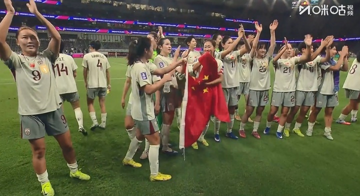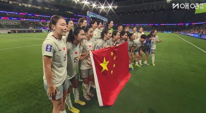 比賽結(jié)束后,中國女足球員們場邊謝場,舉國旗合影,并感謝球迷支持。