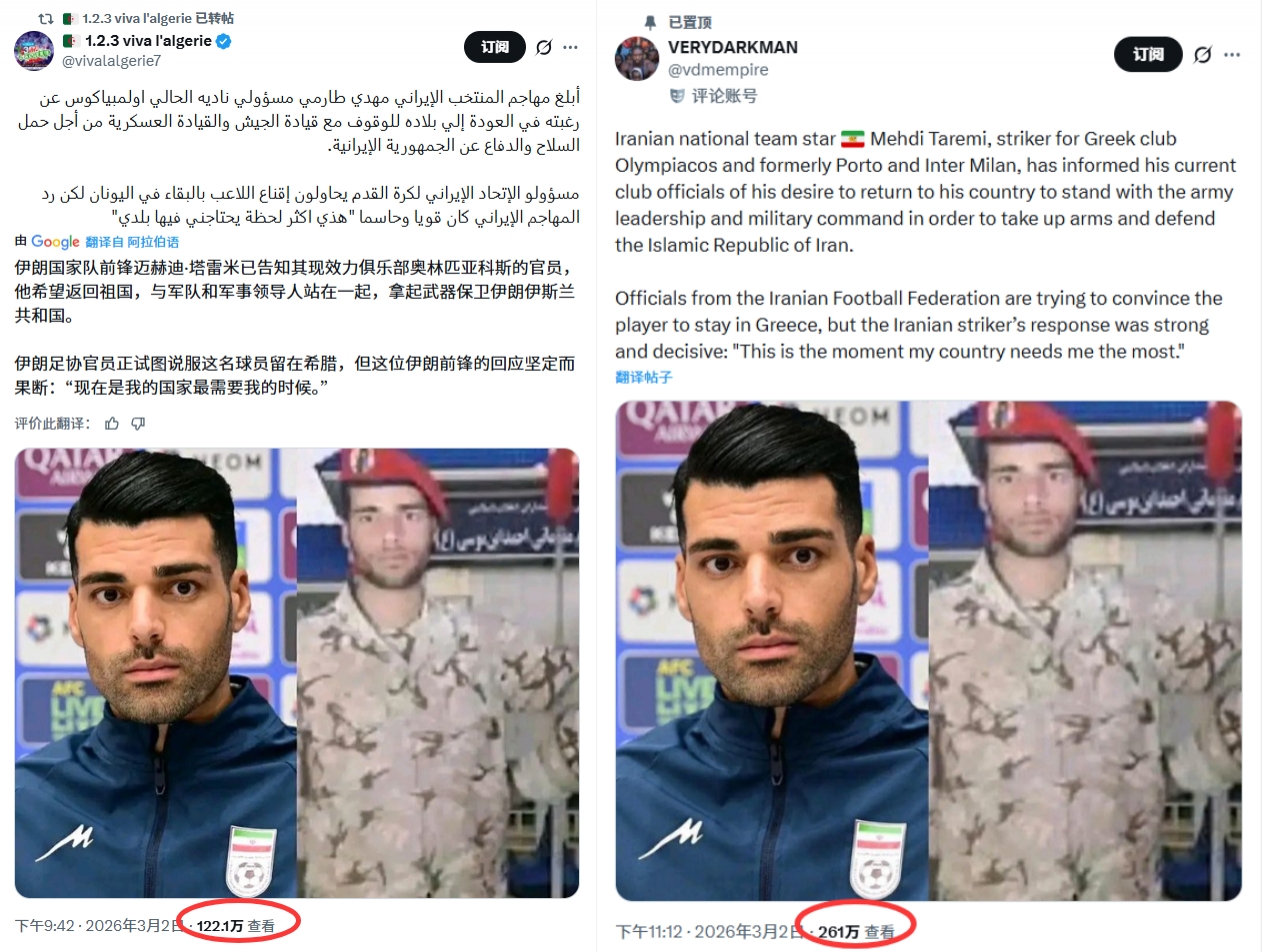 綜合多方信源交叉核實,基本可以判斷“塔雷米回國參戰(zhàn)”的所謂爆料,實際源于海外社交平臺營銷號的起號套路。在層層轉(zhuǎn)載過程中,因缺乏嚴格的事實核查,最終演變?yōu)橐粓鰢@虛假信息展開的流量狂歡。