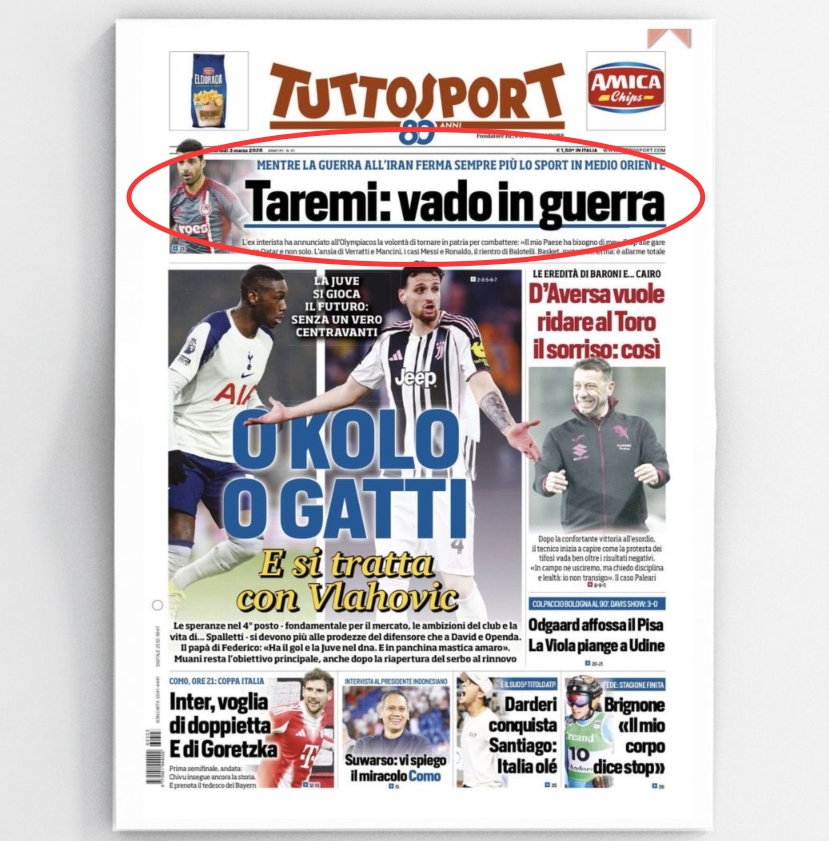 直播吧03月03日訊 今日的都靈體育報頭版報道了伊朗前鋒塔雷米的消息:現(xiàn)效力于奧林匹亞科斯的塔雷米已向球隊傳達了想要離開希臘、返回祖國的決定。