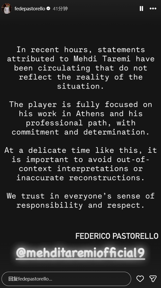 經(jīng)紀(jì)人費(fèi)德里科·帕斯托雷洛寫道:“近期流傳的關(guān)于邁赫迪·塔雷米的言論不符合實(shí)際情況。這位球員正以承諾與決心,完全專注于他在雅典的工作和他的職業(yè)道路。