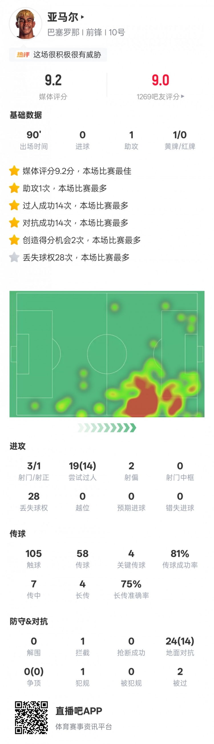 亞馬爾本場數(shù)據(jù):14次過人全場最多+1助攻,評分9.2全場最高