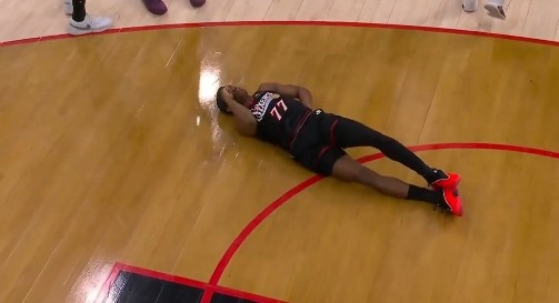 上半場最后一攻,埃奇庫姆反擊追身三分出手,被身后追防的卡特·布萊恩特撞到失去平衡摔倒,背部著地受傷離場,76人官方隨后宣布埃奇庫姆背傷不會回歸。