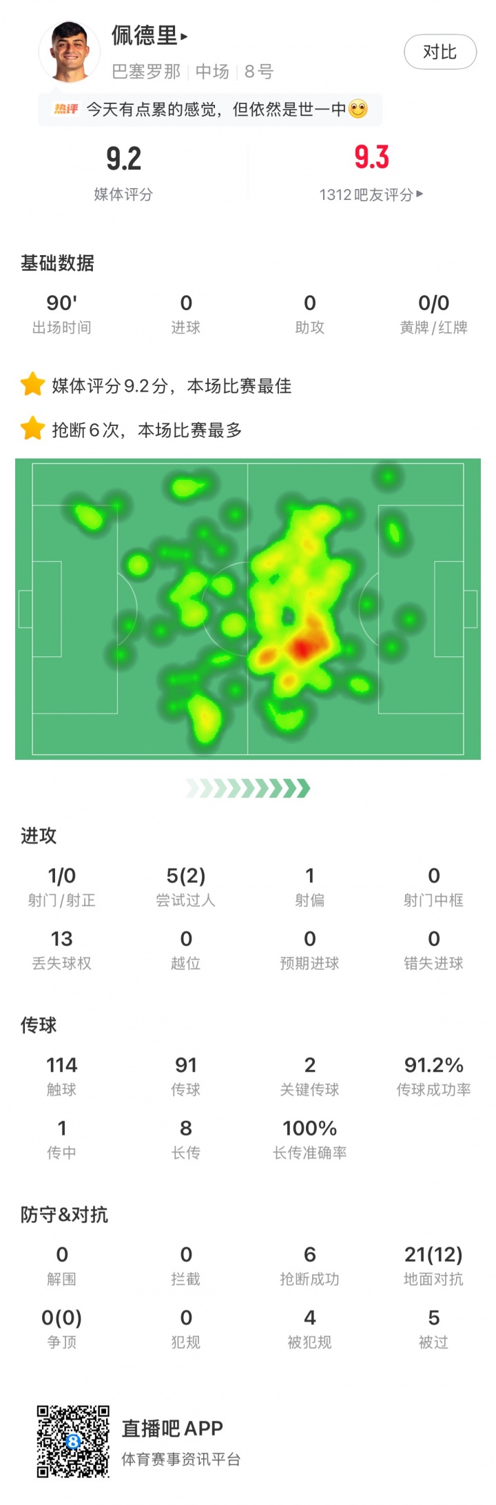 本場比賽,佩德里首發(fā)踢滿全場,媒體評分9.2分,并列全場最高分。賽后佩德里癱坐在地,喘著粗氣,非常疲憊。