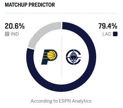 今日ESPN給出本場勝率預測,快船高達79.4%,步行者只有20.6%。
