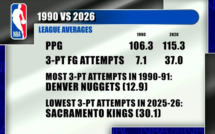2025-26賽季,聯(lián)盟場(chǎng)均得到115.3分,場(chǎng)均三分出手37.0次,最多三分出手的球隊(duì)是國(guó)王場(chǎng)均30.1次