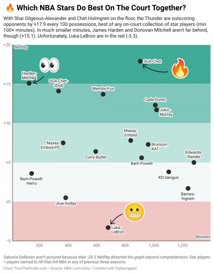 數(shù)據(jù)專家曬球星兩人組凈效值:SGA切特同場(chǎng)+17.9最高 東詹最低