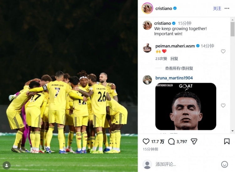 賽后,C羅在社交媒體上寫道:我們攜手共進(jìn),這是一場(chǎng)非常重要的勝利。