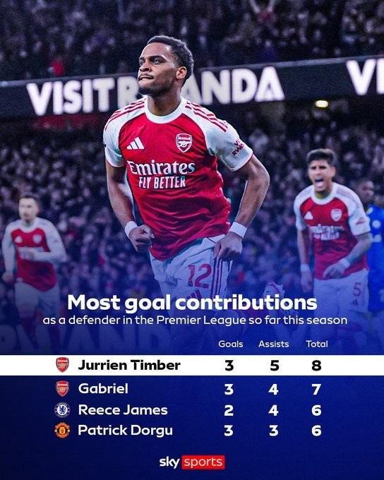 本賽季,廷伯在英超貢獻3球5助攻,共參與8球,在英超后衛(wèi)球員里排名第一,超過加布里埃爾(3球4助造7球)、里斯·詹姆斯(2球4助造6球)和多爾古(3球3助造6球)。