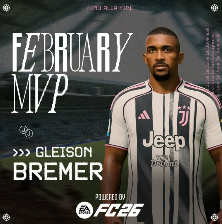 對陣帕爾馬梅開二度,尤文官方:布雷默當(dāng)選隊內(nèi)2月最佳球員