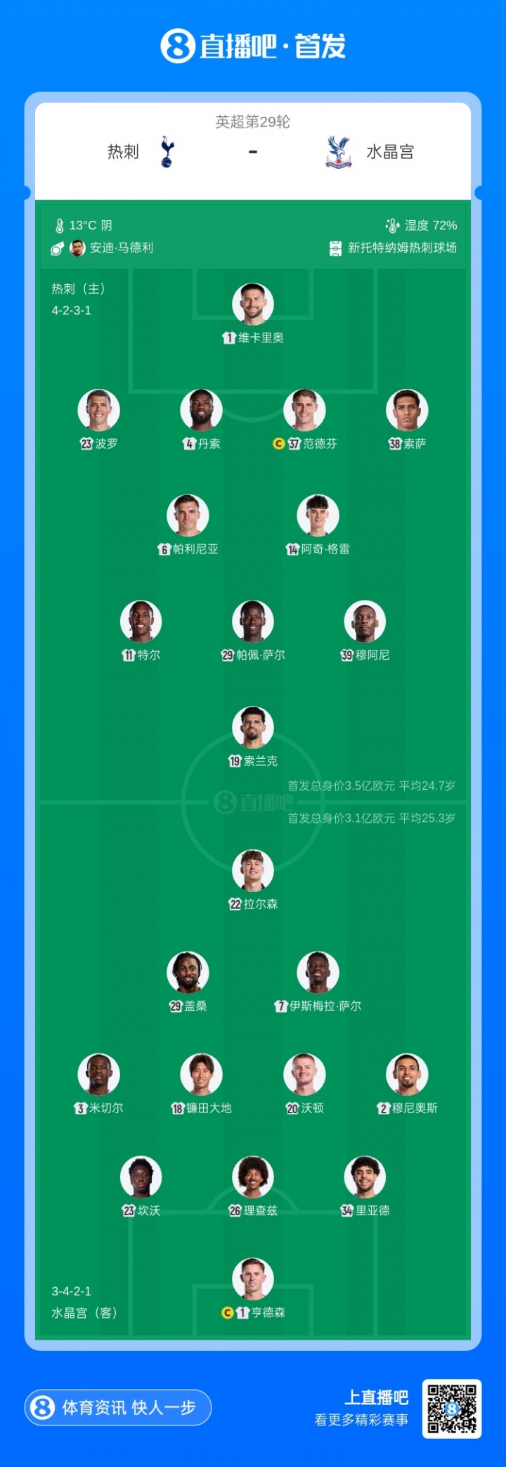 直播吧3月6日訊 北京時間3月6日凌晨4:00,英超第29輪,熱刺vs水晶宮。賽前雙方公布了本場比賽的首發(fā)名單。