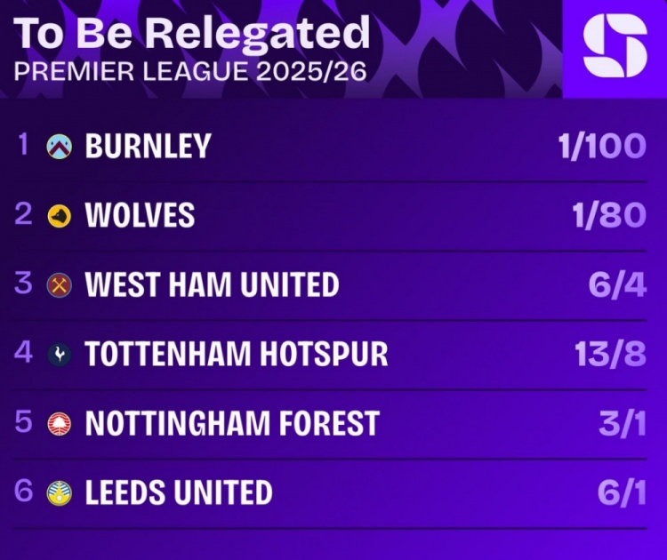 直播吧3月6日訊 英超第29輪比賽,熱刺主場(chǎng)1-3不敵水晶宮。Squawka列出了本賽季英超球隊(duì)降級(jí)賠率排名,伯恩利居首,熱刺第四。