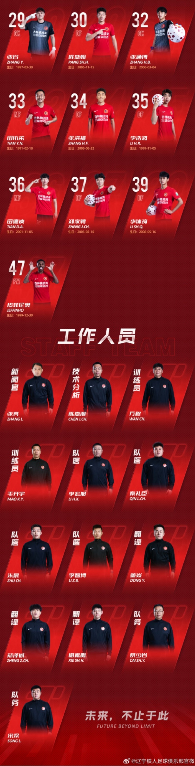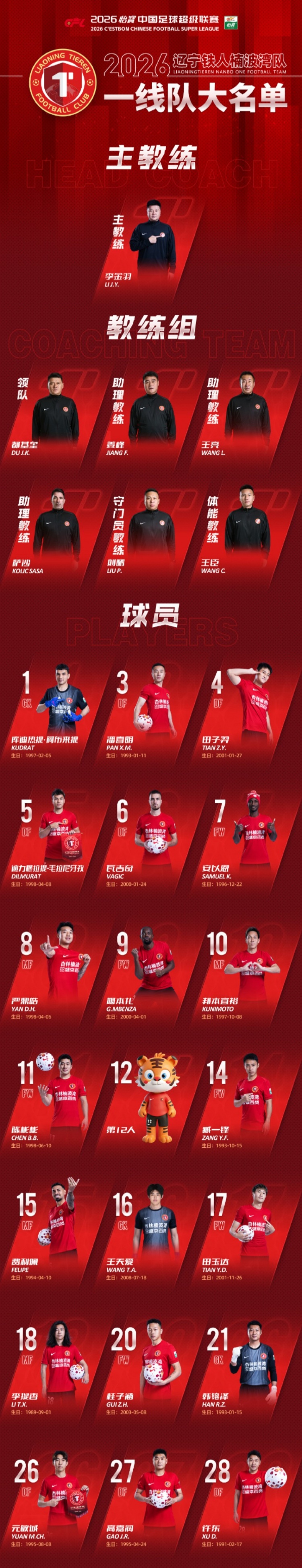 直播吧3月6日訊 中超升班馬遼寧鐵人公布新賽季一線隊球員名單,主教練李金羽,嚴鼎皓8號,邦本宜裕10號,張洪福34號,熱菲尼奧47號。