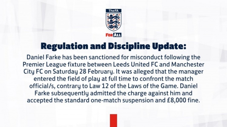 英足總發(fā)布公告:“丹尼爾·法爾克因在利茲聯(lián)對陣曼城的比賽結(jié)束后存在不當(dāng)行為而受到處罰。據(jù)指控,該主教練在全場結(jié)束時進入比賽場地與裁判發(fā)生對峙,此舉違反了《足球競賽規(guī)則》第12條。丹尼爾·法爾克承認(rèn)該項指控,并接受標(biāo)準(zhǔn)的一場停賽處罰,以及8000英鎊罰款?!?/p>