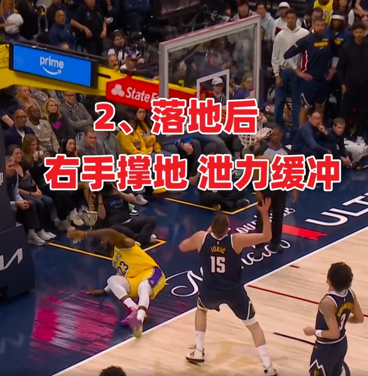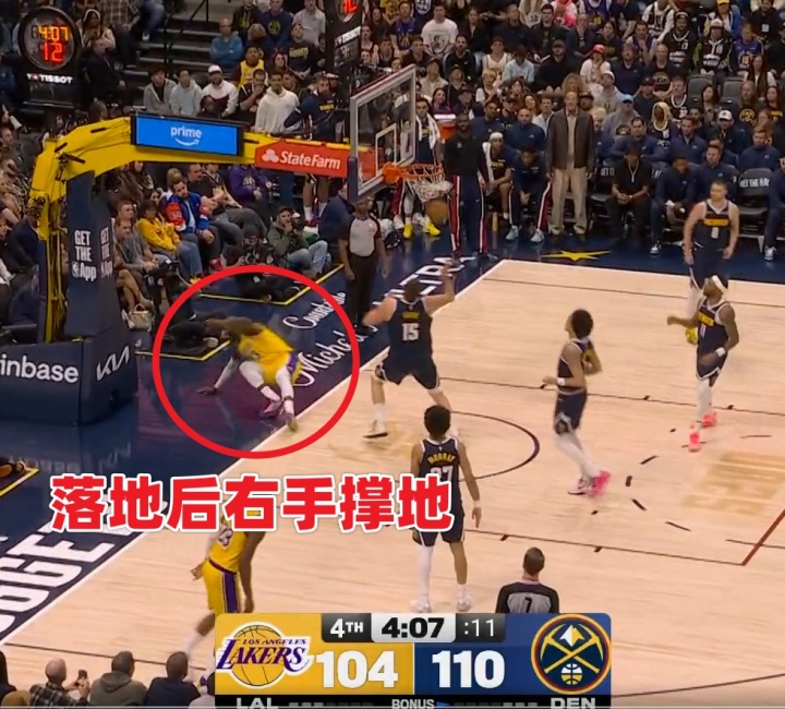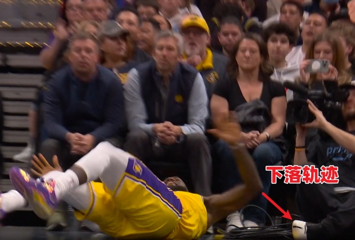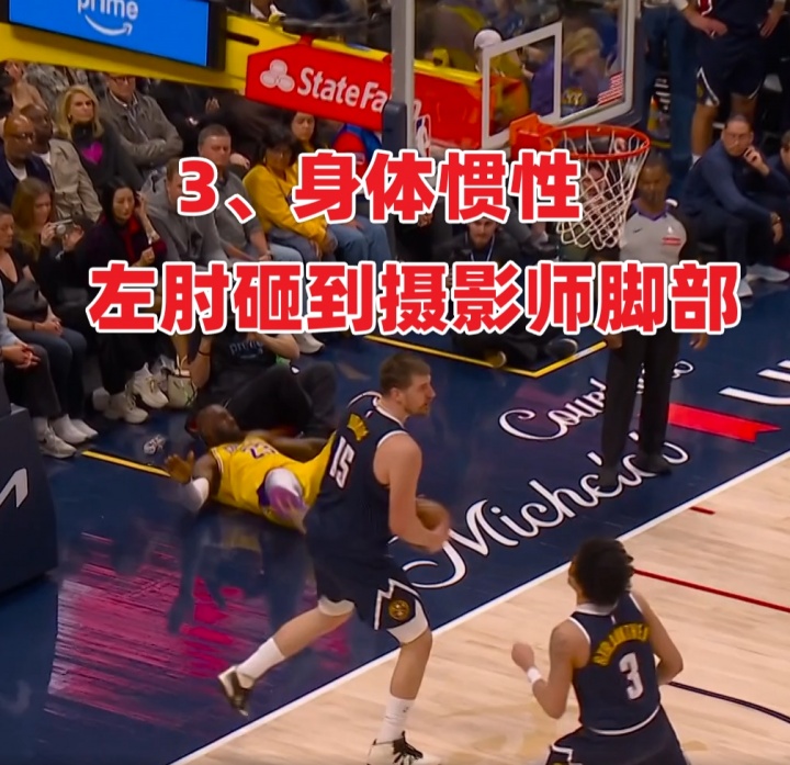1、比賽直播/轉(zhuǎn)播視角顯示,詹姆斯上籃對(duì)抗約基奇后失衡倒地,他右手撐地、隨后順勢(shì)泄力,依靠身體慣性左肘砸到了場(chǎng)邊攝影師的鞋子上。