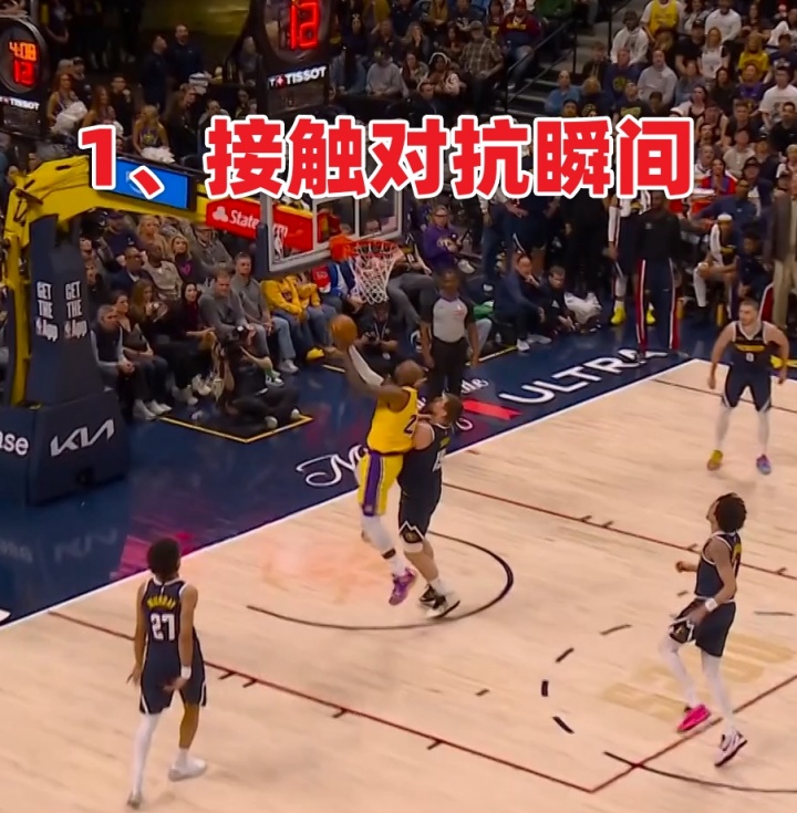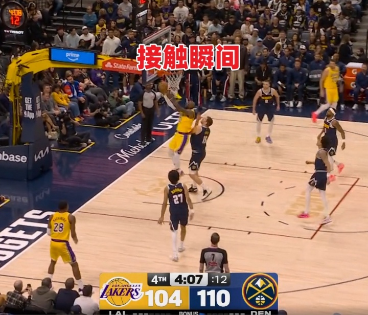 2、慢鏡頭(高角度)顯示,上籃時(shí)接觸到了約基奇的左肩,左肘在落地/受力瞬間發(fā)生快速旋轉(zhuǎn),隨后詹姆斯立即用右手捂住左肘并表現(xiàn)出痛苦表情。