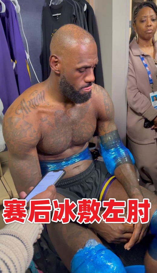 4、在詹姆斯的更衣室賽后采訪中,他已經(jīng)給左肘纏上了厚重的冰袋。