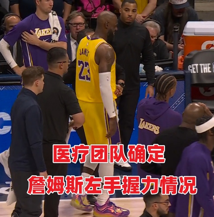 3、場(chǎng)邊隊(duì)醫(yī)迅速進(jìn)入并對(duì)詹姆斯的左肘進(jìn)行現(xiàn)場(chǎng)初步檢查(觸診、活動(dòng)度測(cè)試),在返回替補(bǔ)席后還對(duì)他的手肘進(jìn)行了握力測(cè)試。