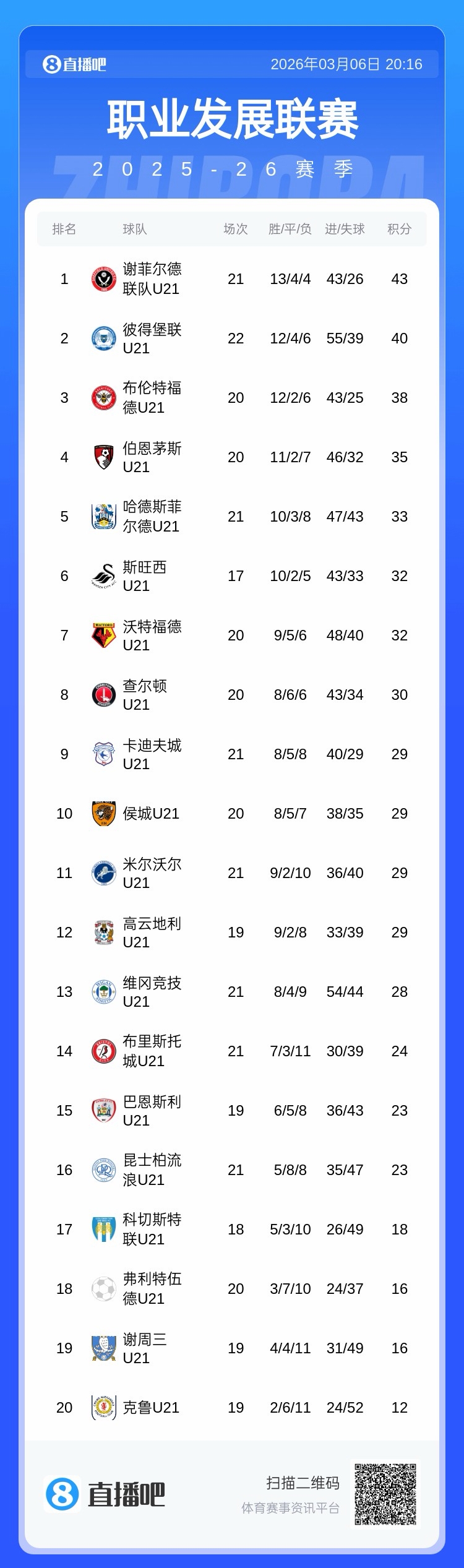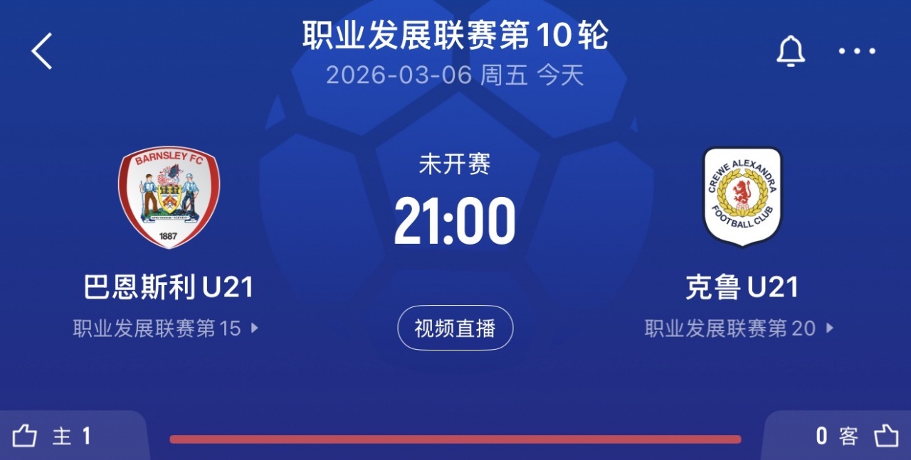 直播吧03月06日訊 英超職業(yè)發(fā)展聯(lián)賽,巴恩斯利U21vs克魯U(kuò)21的首發(fā)出爐,徐彬首發(fā)出戰(zhàn)。