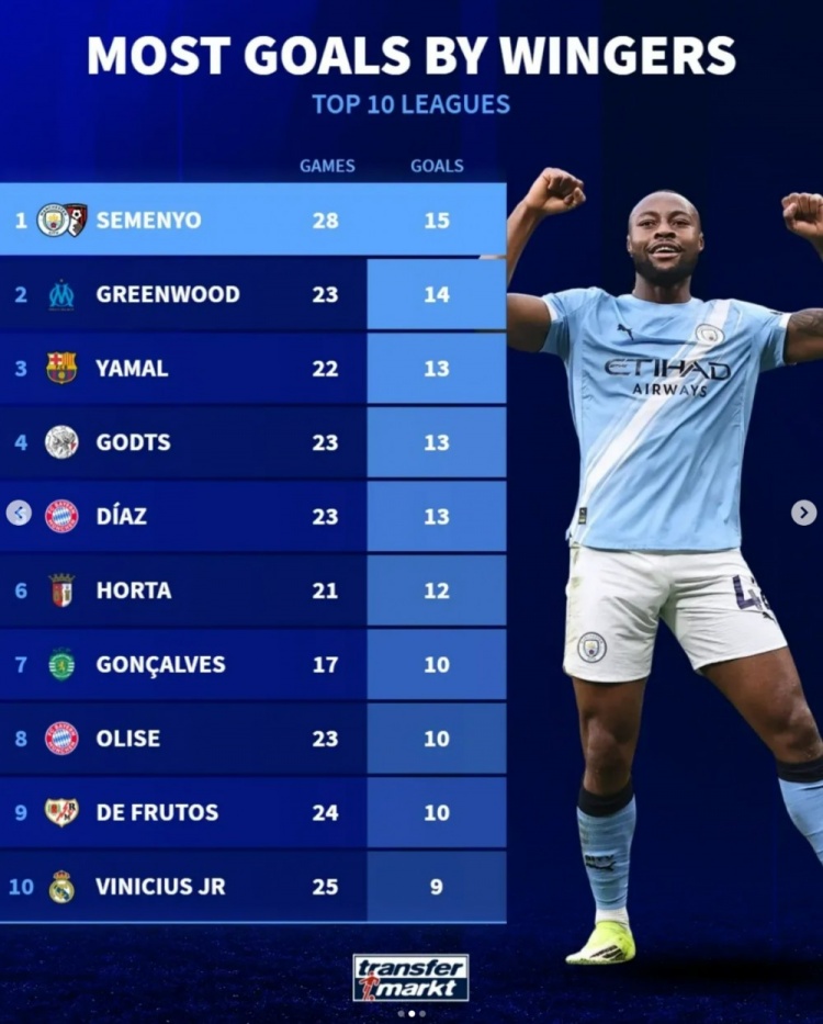 直播吧3月6日訊 德轉(zhuǎn)盤點了本賽季歐洲前十聯(lián)賽邊鋒球員進(jìn)球榜,其中塞梅尼奧居首,具體如下: