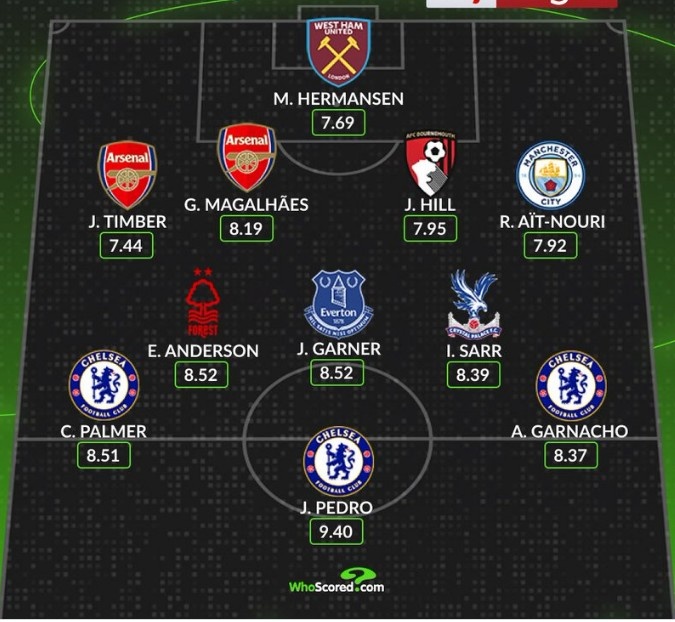 直播吧3月6日訊 數(shù)據(jù)網(wǎng)站W(wǎng)hoscored評選出本輪英超最佳陣容,其中切爾西前場3人入選,以下為具體陣容: