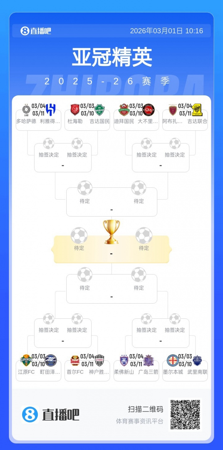 本賽季亞冠精英聯(lián)賽進行到1/8決賽,原定于北京時間3月3日0點開打,西亞區(qū)對陣為多哈薩德vs利雅得新月、杜海勒vs吉達(dá)國民、迪拜國民vs大不里士拖拉機、阿布扎比統(tǒng)一vs吉達(dá)聯(lián)合。
