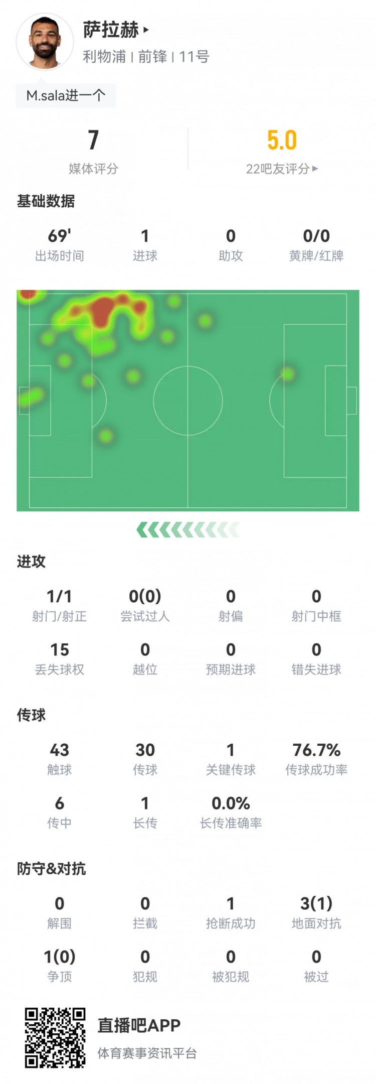 直播吧3月7日訊 足總杯1/8決賽,利物浦3-0客場(chǎng)領(lǐng)先狼隊(duì)。此役薩拉赫首發(fā)69分鐘被換下,球員全場(chǎng)重點(diǎn)數(shù)據(jù)如下↓