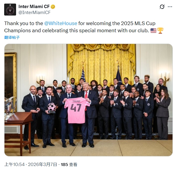 邁阿密國際寫道:感謝白宮熱情歡迎2025年美職聯MLS杯冠軍,并與我們俱樂部共同慶祝這一特殊時刻。