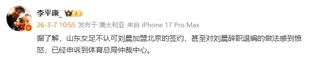 直播吧03月07日訊 今早,北京京壇女足官宣引進(jìn)山東女足門將劉晨,媒體人李平康透露,山東女足不認(rèn)可這筆簽約,已申訴到體育總局仲裁中心。