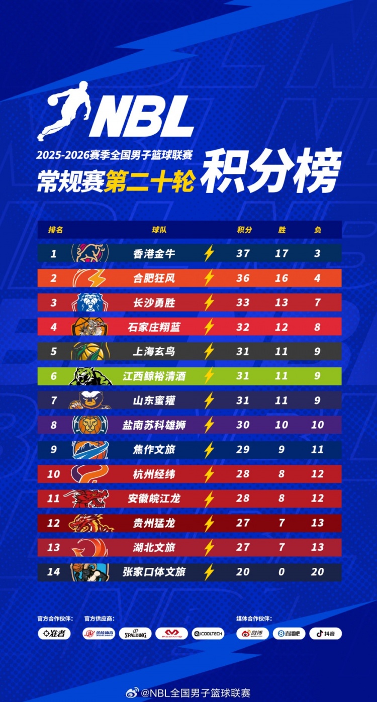 【積分榜】2025-2026賽季NBL常規(guī)賽積分榜(截至第二十輪結(jié)束)