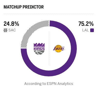 ESPN預測本場勝率:湖人75.2%,國王24.8%。