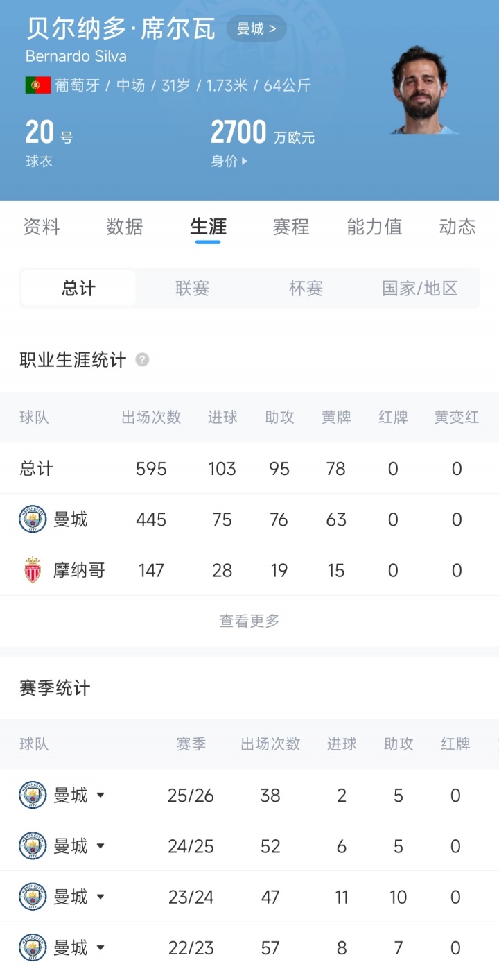 B席于2017年夏窗以5000萬(wàn)歐元的轉(zhuǎn)會(huì)費(fèi)從摩納哥加盟曼城,至今已為曼城效力近9年,出戰(zhàn)445場(chǎng)比賽貢獻(xiàn)75球76助,幫助球隊(duì)贏得6次英超冠軍、1次歐冠冠軍、1次世俱杯冠軍、2次足總杯冠軍、4次聯(lián)賽杯冠軍、1次歐超杯冠軍。
