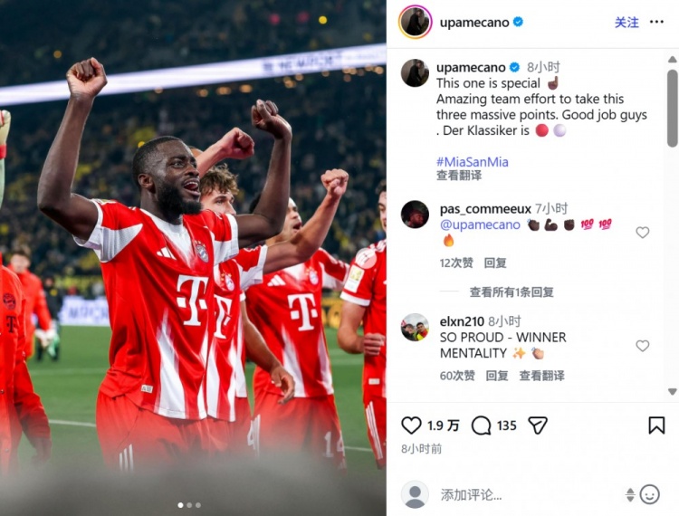 賽后拜仁后衛(wèi)于帕梅卡諾在社媒曬出球隊(duì)?wèi)c祝勝利的照片,配文寫(xiě)道:“這場(chǎng)勝利尤為珍貴,全隊(duì)付出不懈的努力收獲重要的三分!大家漂亮的完成任務(wù)!國(guó)家德比勝利屬于拜仁!”