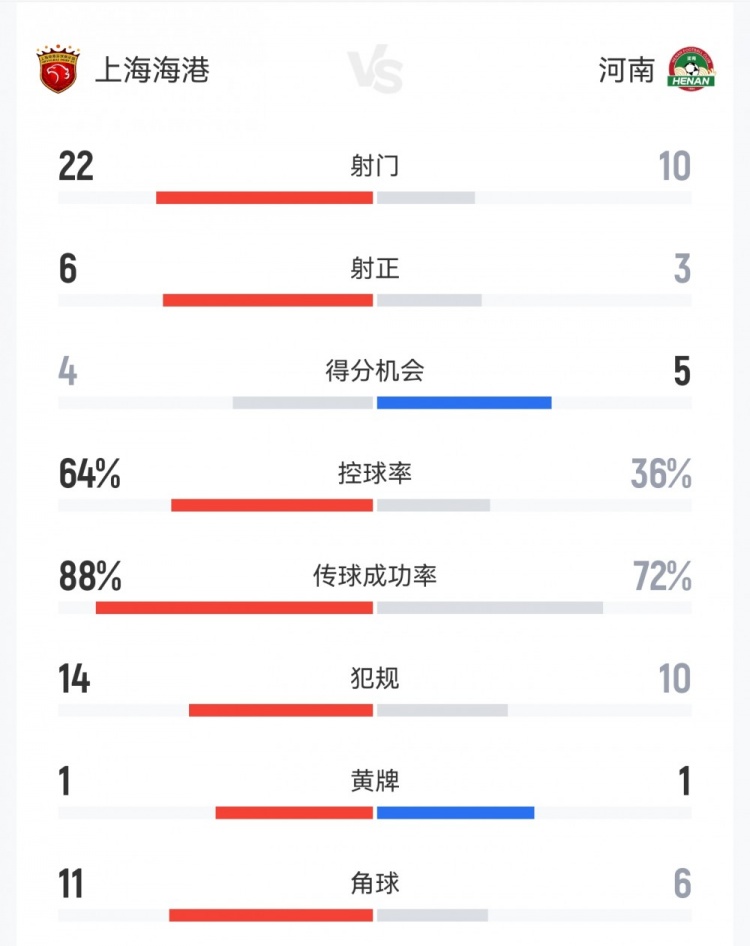 海港1-2河南數(shù)據(jù):射門22-10,射正6-3,得分機會4-5,犯規(guī)14-10