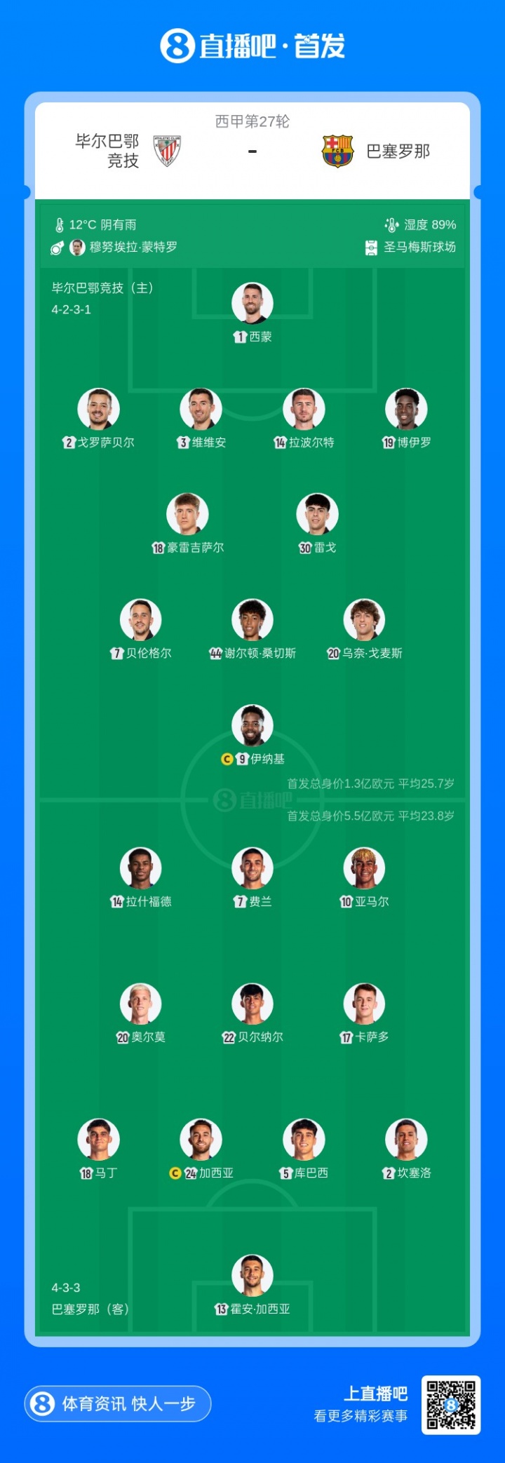 巴薩首發(fā):13-霍安·加西亞、2-坎塞洛、5-庫巴西、18-赫拉德·馬丁、24-埃里克·加西亞、17-卡薩多、22-貝爾納爾、20-奧爾莫、7-費蘭、10-亞馬爾、14-拉什福德