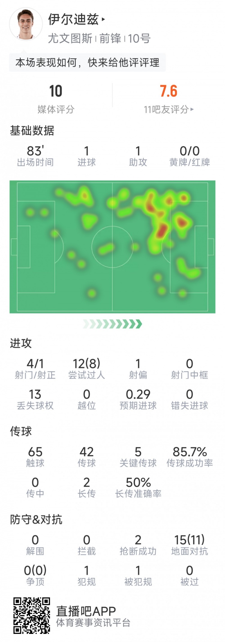 直播吧3月8日訊 在本輪意甲尤文對陣比薩的比賽中,伊爾迪茲傳射建功,以下為他在本場數(shù)據(jù):