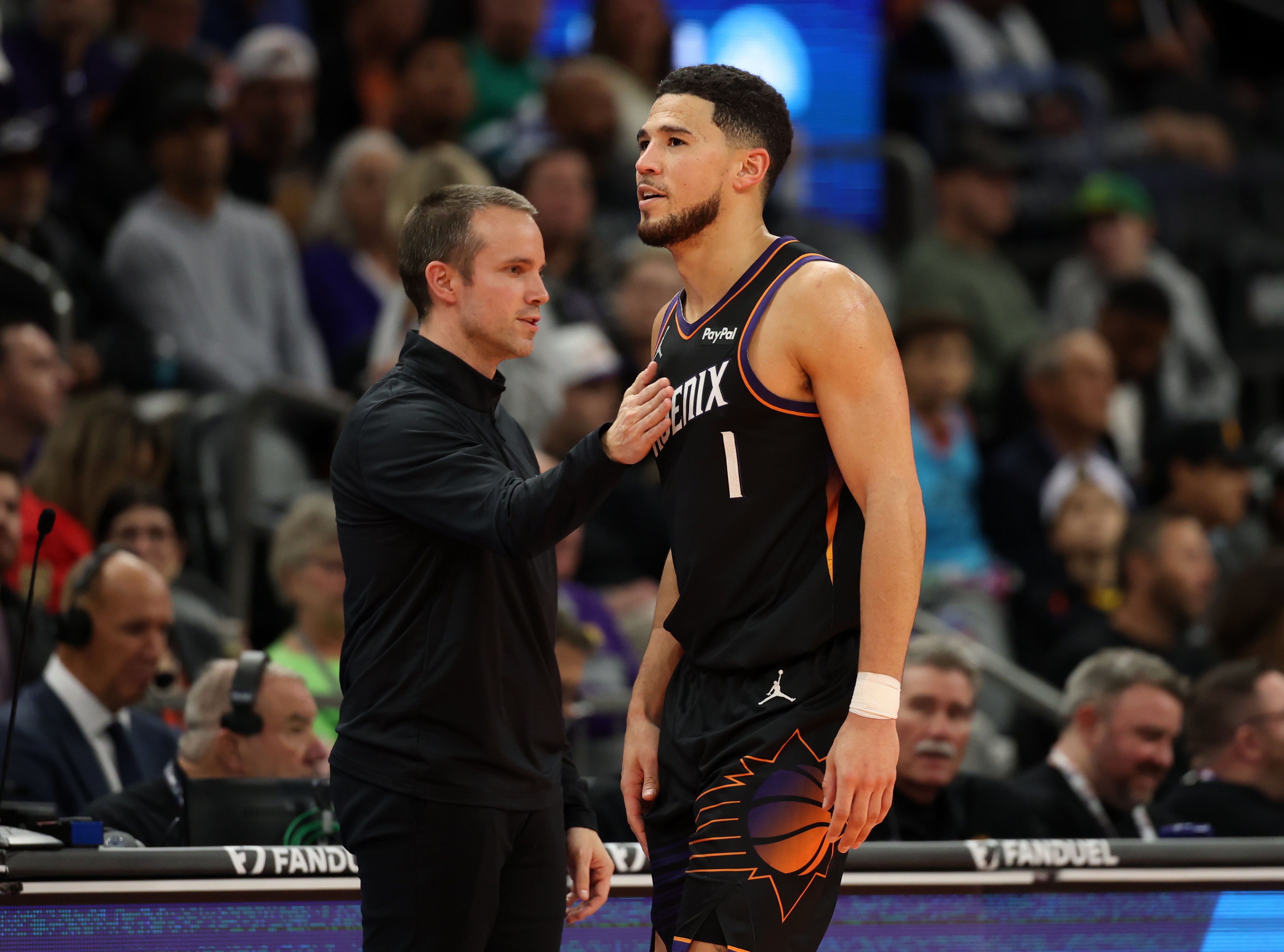 布克全場出戰(zhàn)35分20秒,21投10中(三分12中5)、罰球8中7,轟下全場最高32分外加4籃板4助攻2搶斷,4次失誤瑕不掩瑜,正負(fù)值+1。