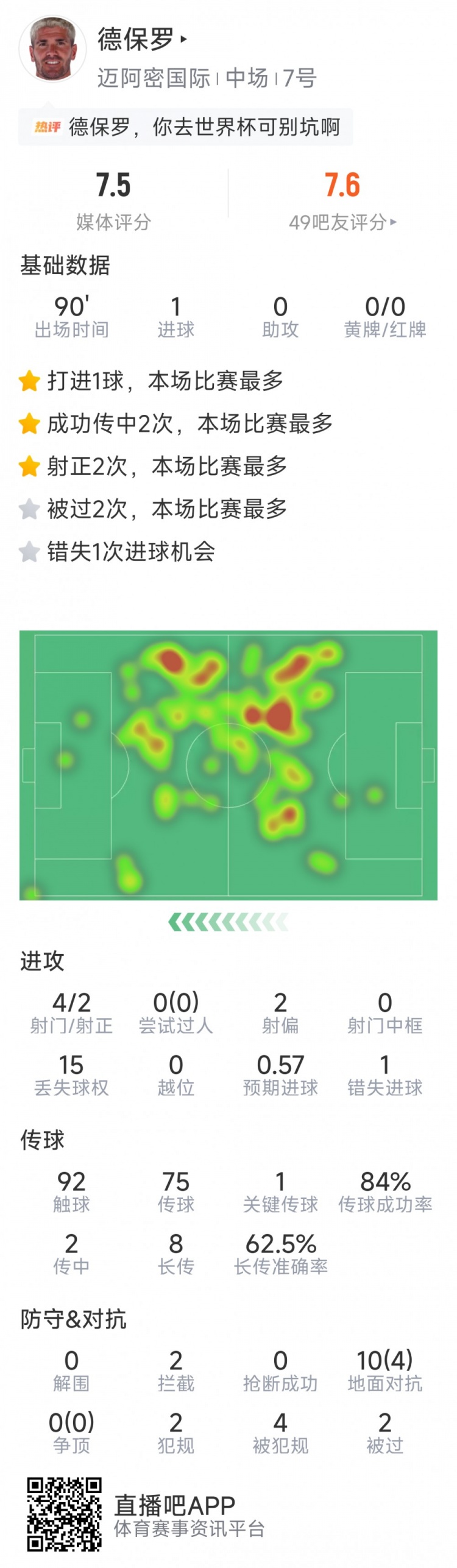 直播吧3月8日訊 在本輪美職聯(lián),邁阿密國際2-1擊敗華盛頓聯(lián),德保羅打進(jìn)一球,以下為他在本場數(shù)據(jù):
