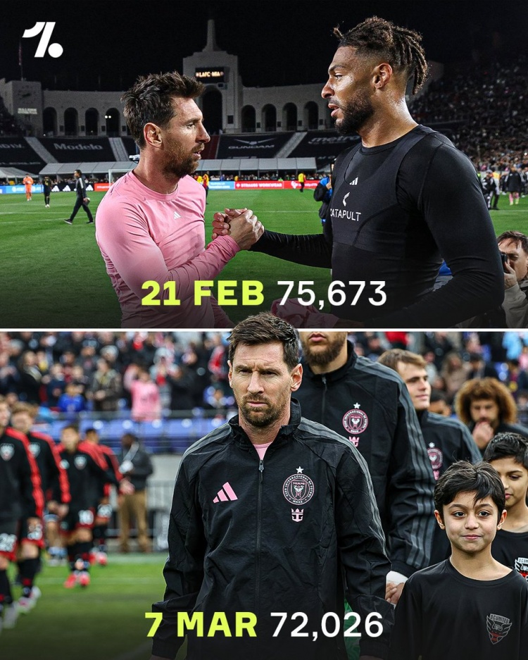 客場對陣洛杉磯FC(75673人)、華盛頓聯(lián)(72026人)的兩場比賽,邁阿密國際一個月內(nèi)兩次幫助對方刷新主場上座人數(shù)紀(jì)錄。