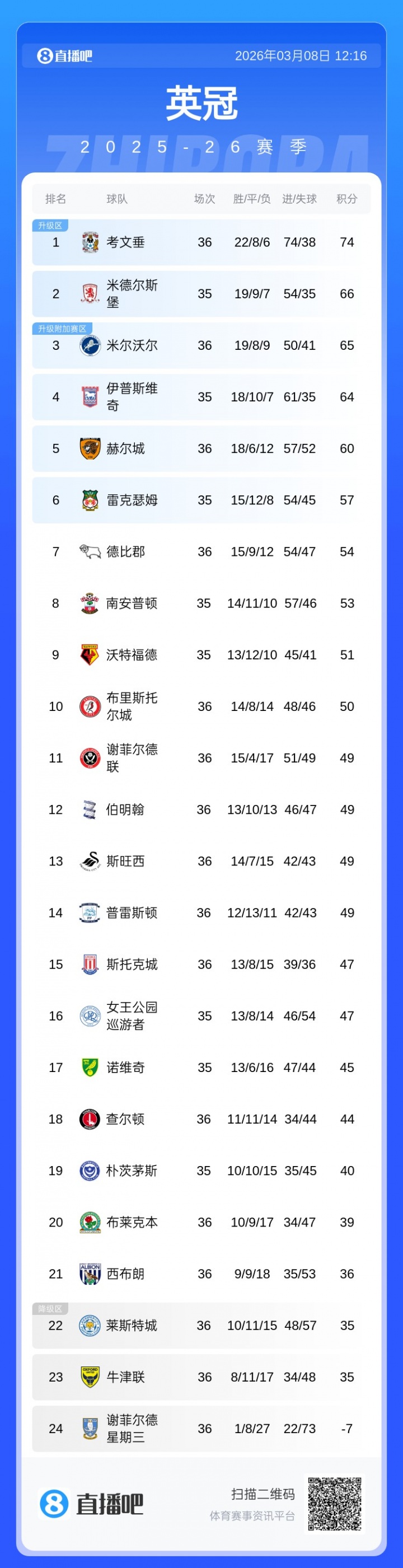 掙扎!英冠積分榜:藍(lán)狐10輪不勝仍居降級(jí)區(qū),考文垂回暖8分領(lǐng)跑