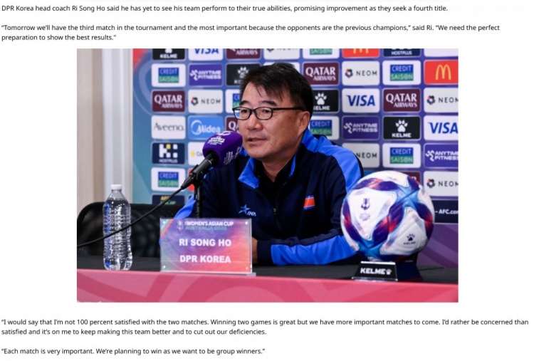 直播吧3月8日訊 據(jù)亞足聯(lián)官網(wǎng)報道,朝鮮女足主教練李松浩在對陣中國女足的賽前新聞發(fā)布會上表示,球隊尚未展現(xiàn)出真正實力,沖擊隊史第四座冠軍獎杯的路上仍需繼續(xù)提升。