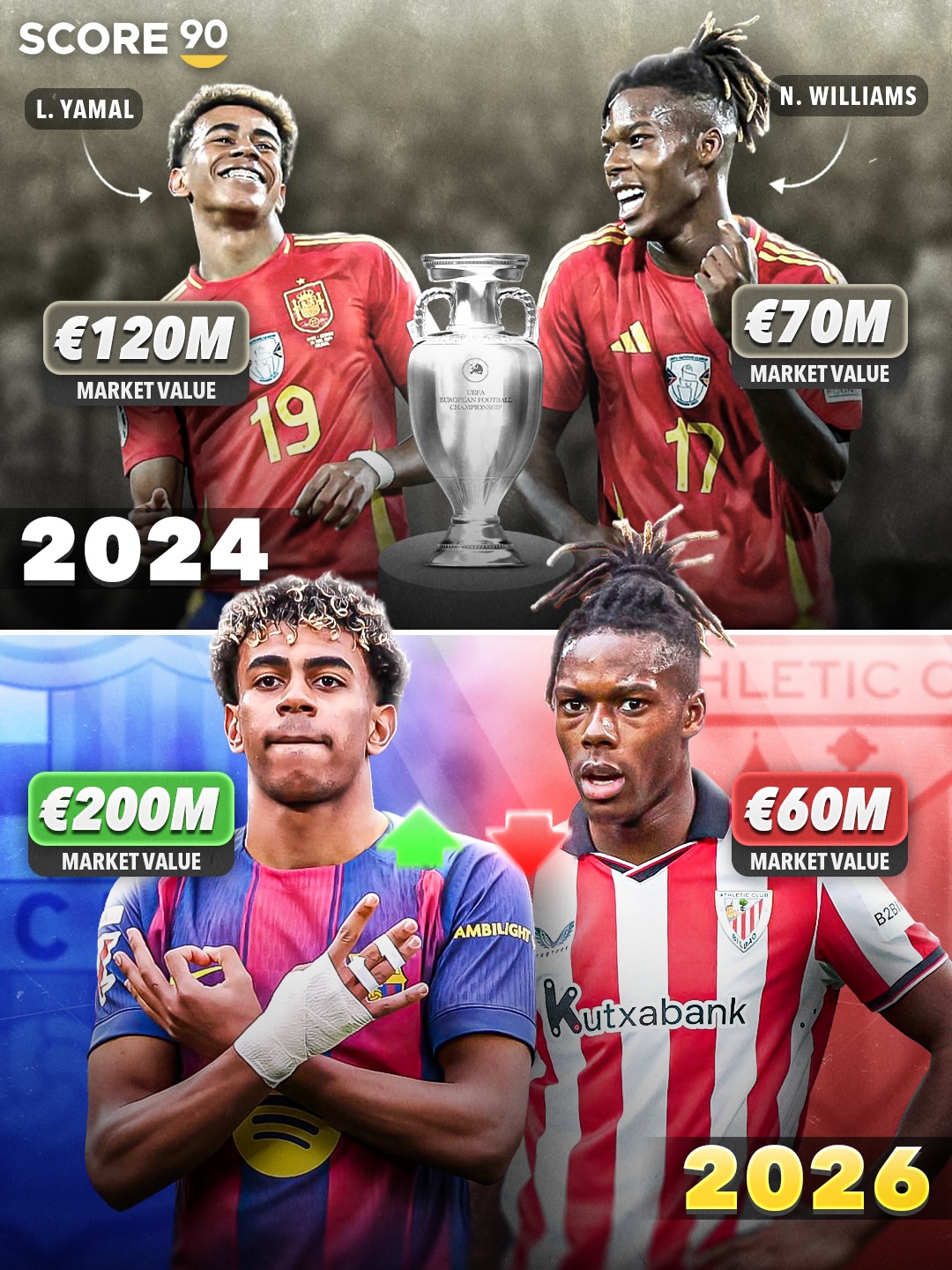 目前18歲的亞馬爾德轉身價已經(jīng)高達2億歐元,貴為當今足壇身價第一;而23歲的尼科在上升期卻遭遇了身價下跌,目前的身價已經(jīng)跌到了6000萬歐元。