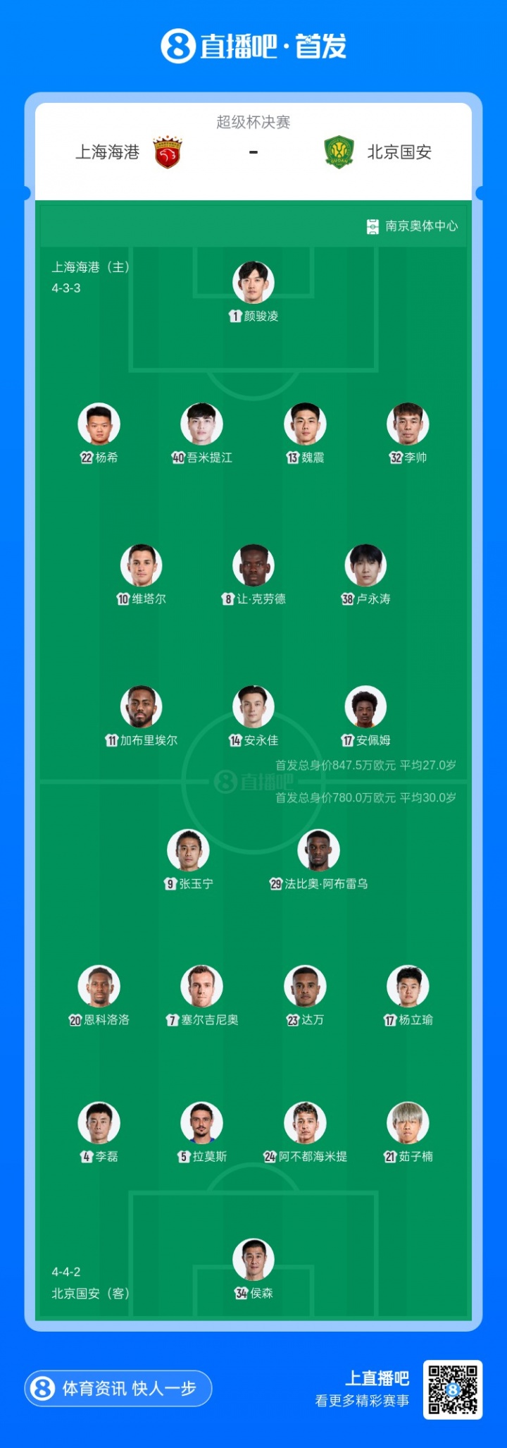 直播吧3月1日訊 北京時(shí)間15:30,中國足球協(xié)會(huì)超級(jí)杯,上海海港vs北京國安在南京奧體中心體育場進(jìn)行。