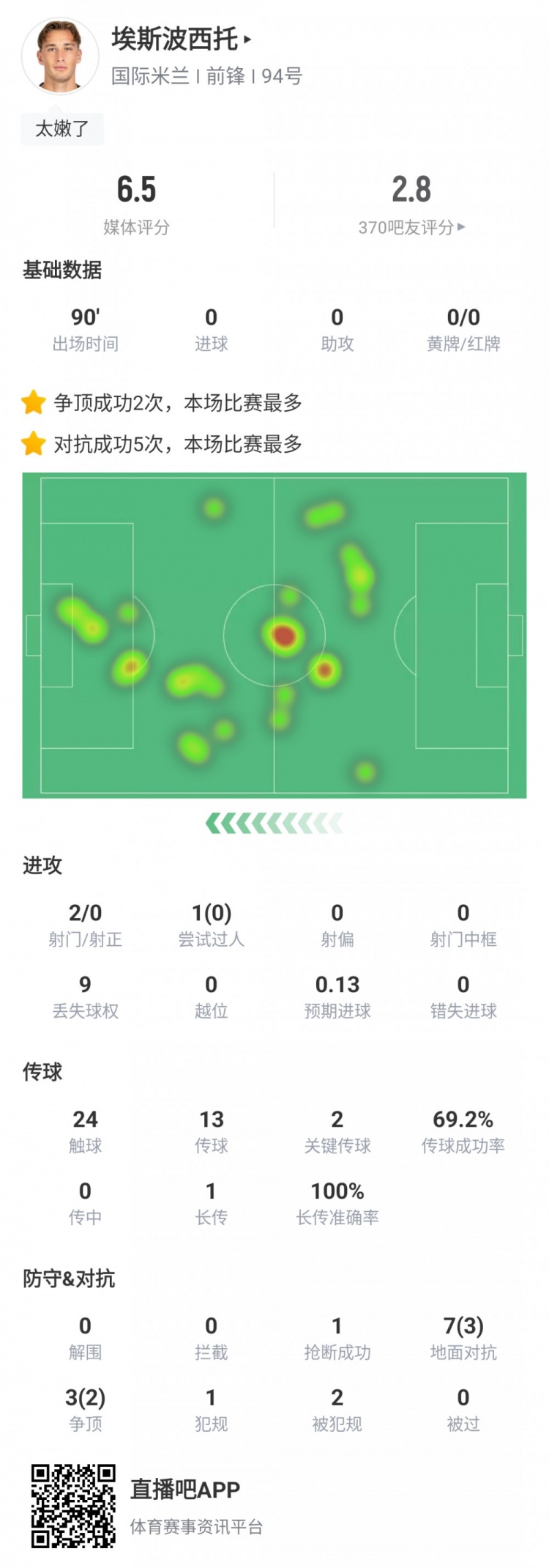 觸球24次、傳球13次、關(guān)鍵傳球2次、傳球成功率69.2%、長(zhǎng)傳1次