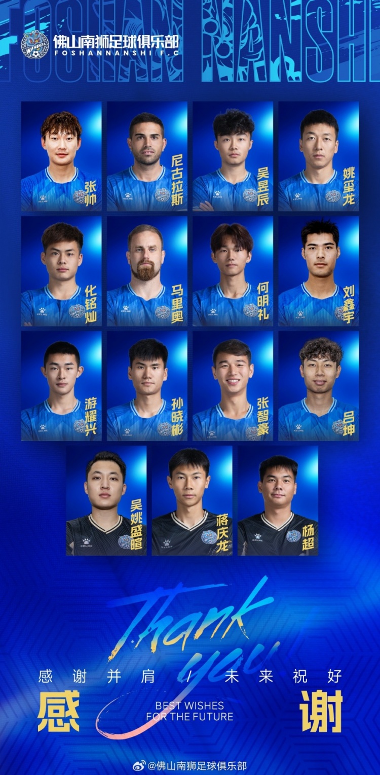 經(jīng)友好協(xié)商,球員張帥、尼古拉斯、楊超、姚璽龍、馬里奧、蔣慶龍、劉鑫宇、游耀興、孫曉彬、吳姚盛暄、何明禮、吳昱辰與佛山南獅足球俱樂部合同到期,正式離隊。球員化銘燦、張智豪、呂坤與佛山南獅足球俱樂部租借期滿,雙方不再續(xù)約。
