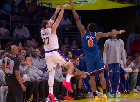 布倫森的吃飯家伙是小打大,拉開空間后靠肩背扛身位投籃。雖然今天之前他37投9中,但底子依然在。湖人今天沒給他從容一對一的機(jī)會(huì),夾擊時(shí)機(jī)和輪轉(zhuǎn)極專注。邁克·布朗逼著布倫森全場只歇了6分鐘,因?yàn)闆]布倫森,尼克斯其他人也扛不開空間。