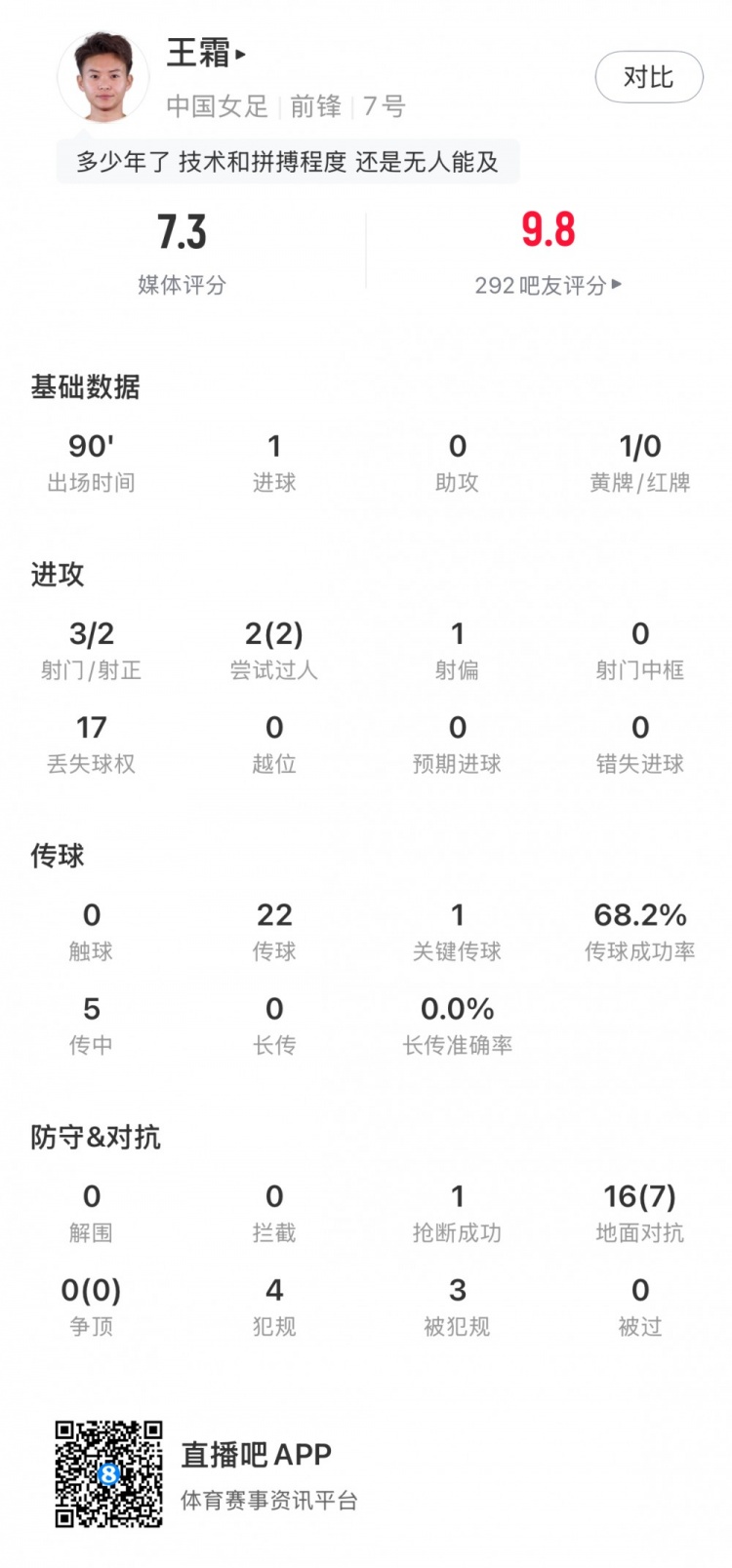 王霜數(shù)據(jù):1粒進(jìn)球、1次關(guān)鍵傳球,4次犯規(guī)3次被犯規(guī),獲評(píng)7.3分