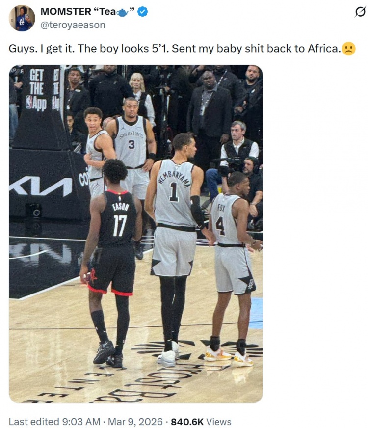 在本場比賽中,伊森三次吃帽,其中兩次是被文班蓋掉;伊森媽媽更推道:“伙計們,我看出來了。那個男孩(伊森、2米03)在文班亞馬(2米24)跟前看起來只有1米55(5英尺1英寸),他(文班亞馬)一掌把我兒子扇回非洲了???!?/p>