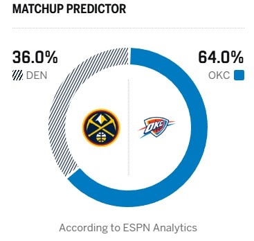 ESPN今日給出本場勝率預(yù)測,雷霆高達(dá)64.0%,掘金為36.0%。